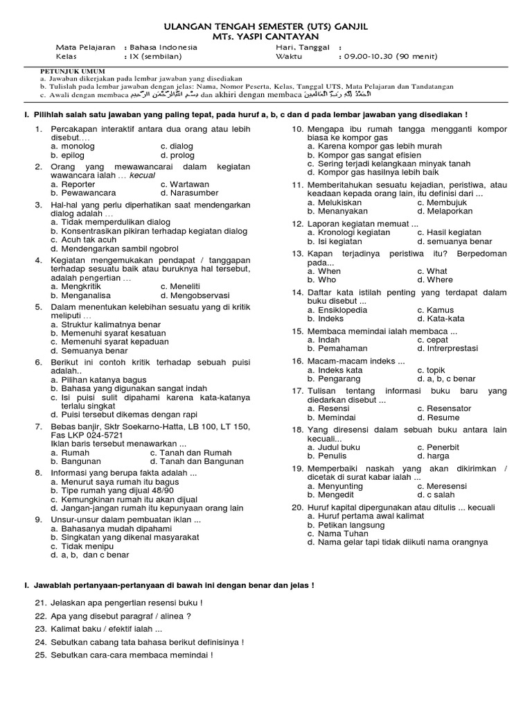 Kisi-Kisi Uts Bahasa Indonesia Kelas 9 Semester 2 : Soal Bahasa Indonesia Kelas 7 Semester 1 2 Beserta Jawaban - 60+ contoh soal uts bahasa indonesia kelas 11 semester 2 k13 & jawabannya.