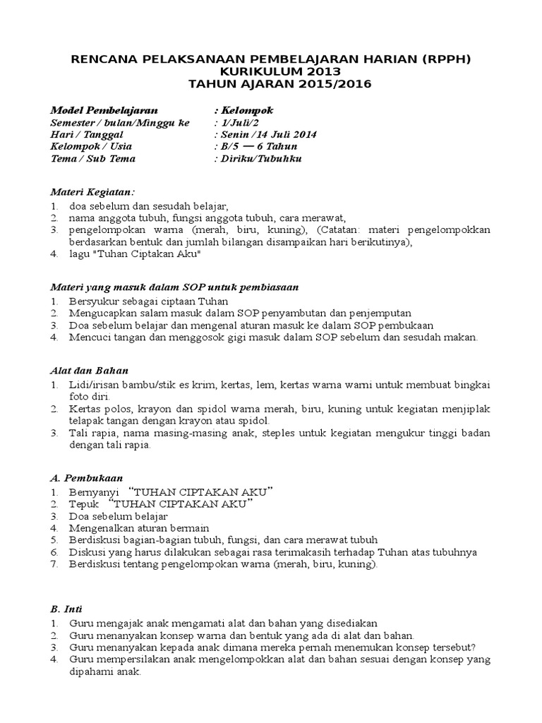 Contoh rpph kurikulum 2013 untuk paud. Seperti protah program tahunan, promes program semester, rkm rencana kegiatan mingguan atau disebut juga rppm rencana pelaksanaan pembelajaran mingguan, rkh rencana kegiatan harian atau disebut juga rpph. Karena dengan adanya rencana pelaksanaan pembelajaran ( rpph ) seorang guru dapat melaksanakan proses belajar mengajar dengan baik dan berkesinambungan dengan hasil penilaian yang optimal untuk membangun sikap pengetahuan dan sikap ketampilan yang dimiliki oleh peserta didik. Identitas program, materi, alat dan bahan, kegiatan. Contoh rkh rpph paud kurikulum 2013 lengkap terbaru wikiedukasi paud.